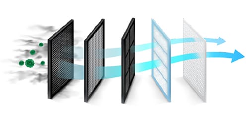 The most common purification method uses an air filter, no different than most people routinely change in their homes. Filters, made of a net of synthetic fibers, are remarkably effective at capturing particles as small as viruses at an efficiency rate of 99.97%. These filters can also be made from compressed carbon, which is designed to capture pollutants such as smoke and cooking fumes instead of contaminated air particles. The drawback, however, is as contaminates accumulate within the filter, the more resistance it poses to the air circulating through it. If not replaced regularly, filters can eventually restrict airflow entirely due to particulate buildup.