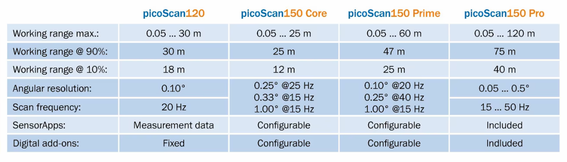 The picoScan family offers much better light and dark ranges as you step up through the variants. The picoScan150 Core detects light targets at up to ~25m and dark targets at up to ~12m. The picoScan150 Prime roughly doubles that, detecting light targets at up to ~47m and dark targets at up to ~25m, and the picoScan150 Pro almost doubles that again, detecting light targets at up to ~75m and dark targets at up to ~40m. You really see a big jump in range as you go from Core to Prime to Pro, which allows users to tackle difficult application challenges.