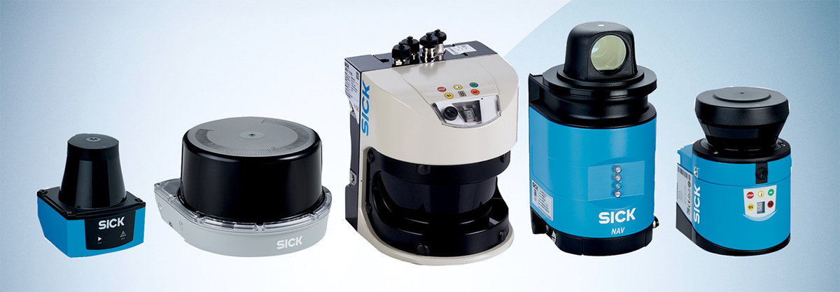 SICK offers a broad range of 2D LiDAR sensors, including (from left to right) the TiM, LMS1000, LMS5xx, NAVX3xx, and LMS1xx series.